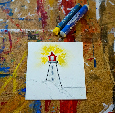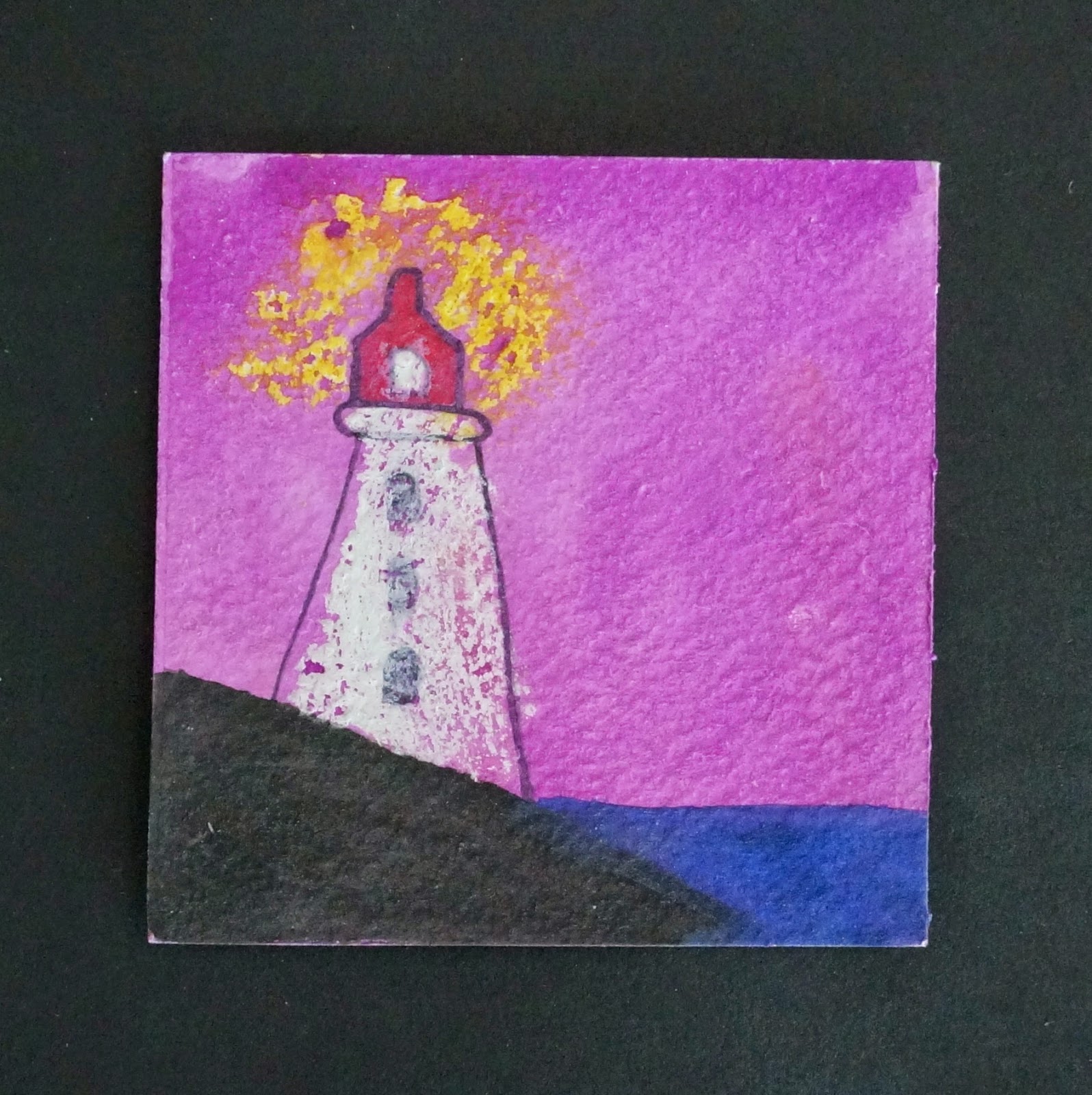 With the yellow oil pastel draw smudge on the glow from the lighthouse.  Put white oil pastel where the light is and on the lighthouse tower.