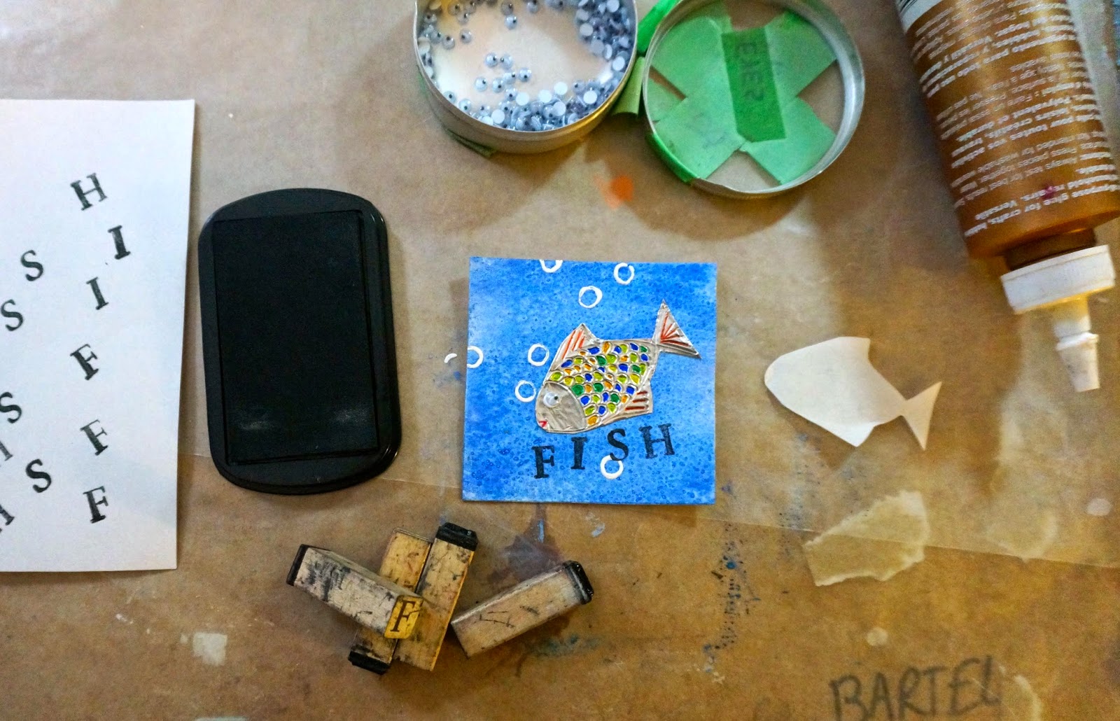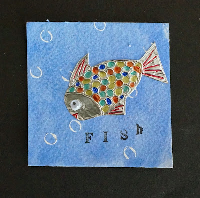 Using stamps you can stamp on the word FISH.  At school I printed out text and the kids glued it on the square.