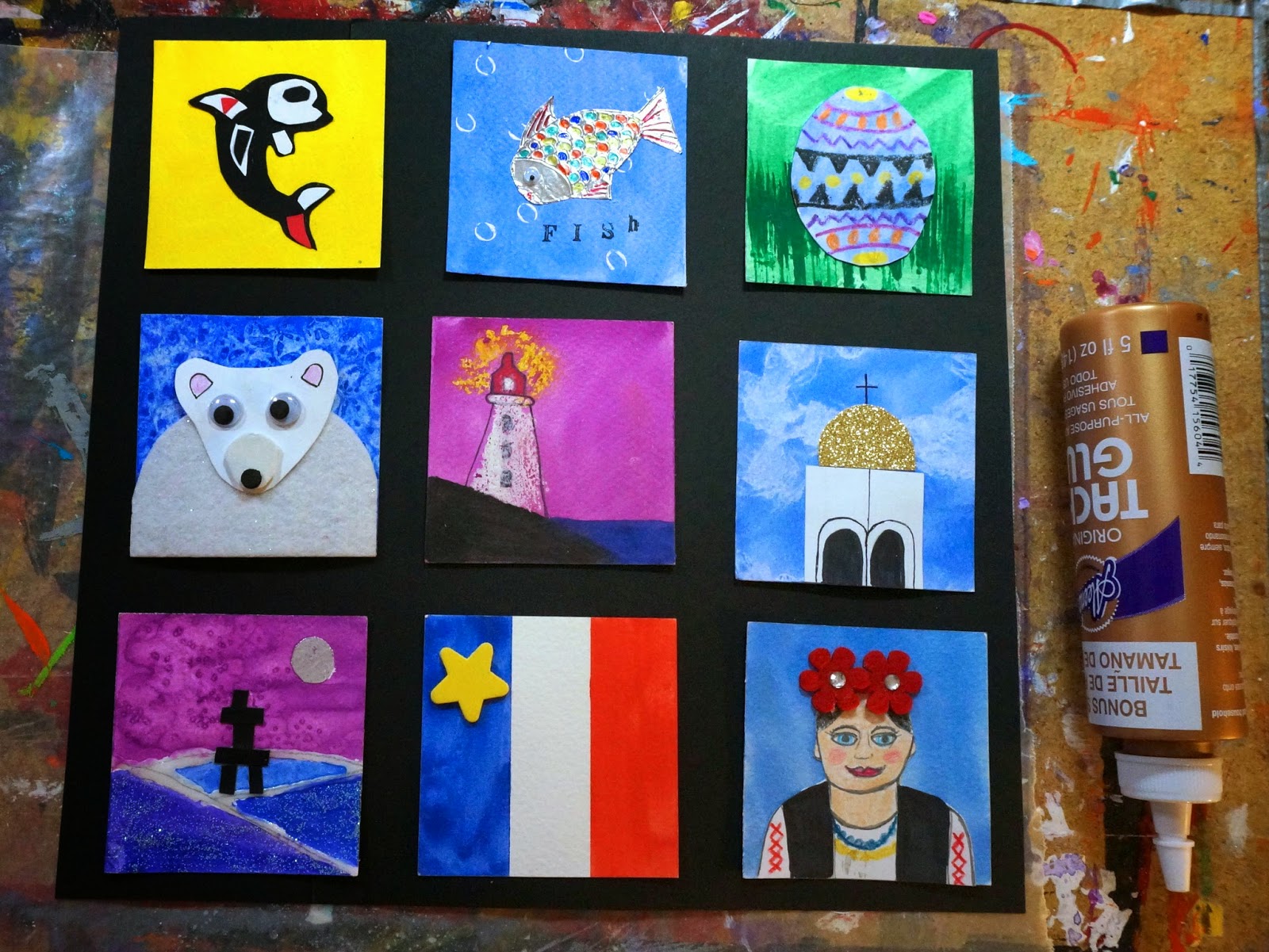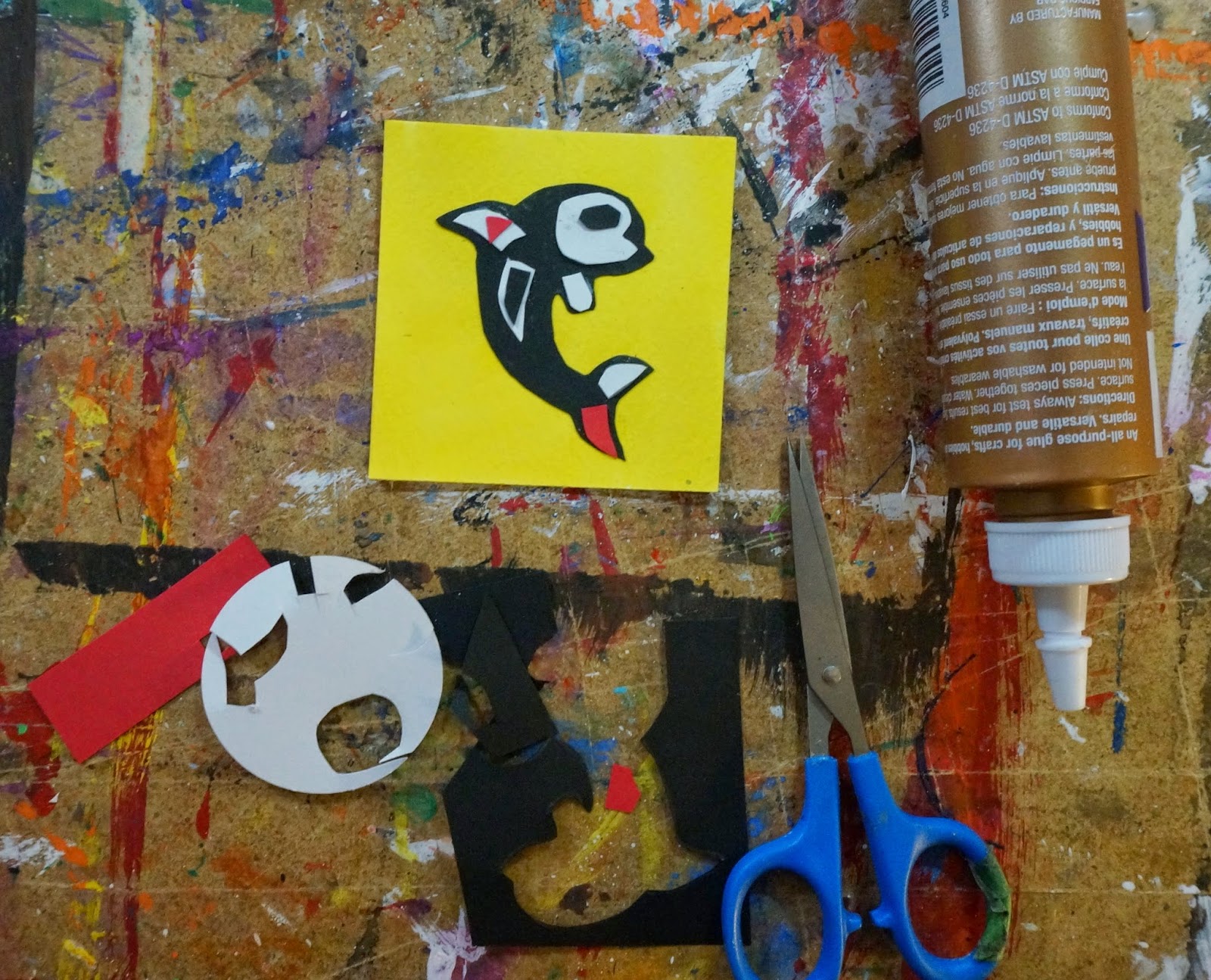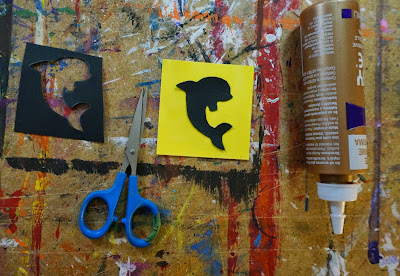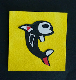 Trace around whale template on black paper.  Cut out and glue onto the yellow square.