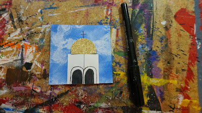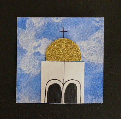Glue on a square of white paper.  Using a black sharpie or pencil crayon draw on some windows of the church.
