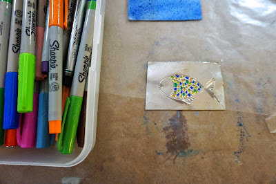 Cut out the fish, peel and stick the metal tape fish onto the blue square.