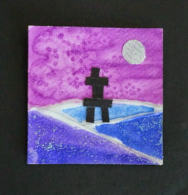 Out of a scrap of black paper cut a little inukshuk and glue into place.