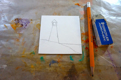 On a square draw some rocks, a water line and a lighthouse.