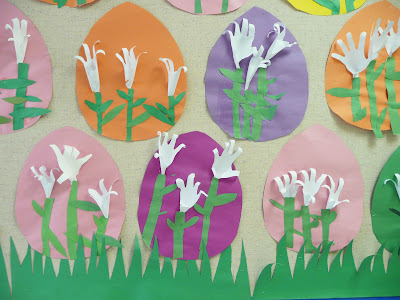 Cut leaves and stems out of the green paper. Glue into place on the egg and then glue the lilies on.
