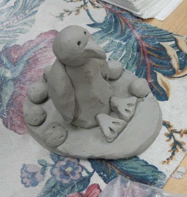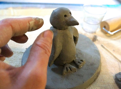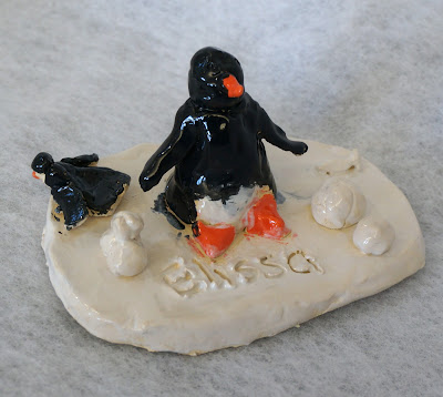 Place the penguins aside to dry. Drape with a garbage bag or plastic tablecloth for 1-2 days to let it equalize. When leather hard then remove the drape and let it dry out completely.