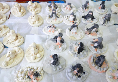 I put a wax coat on the bottom of the penguins to stop them from sticking to the kiln shelf.
