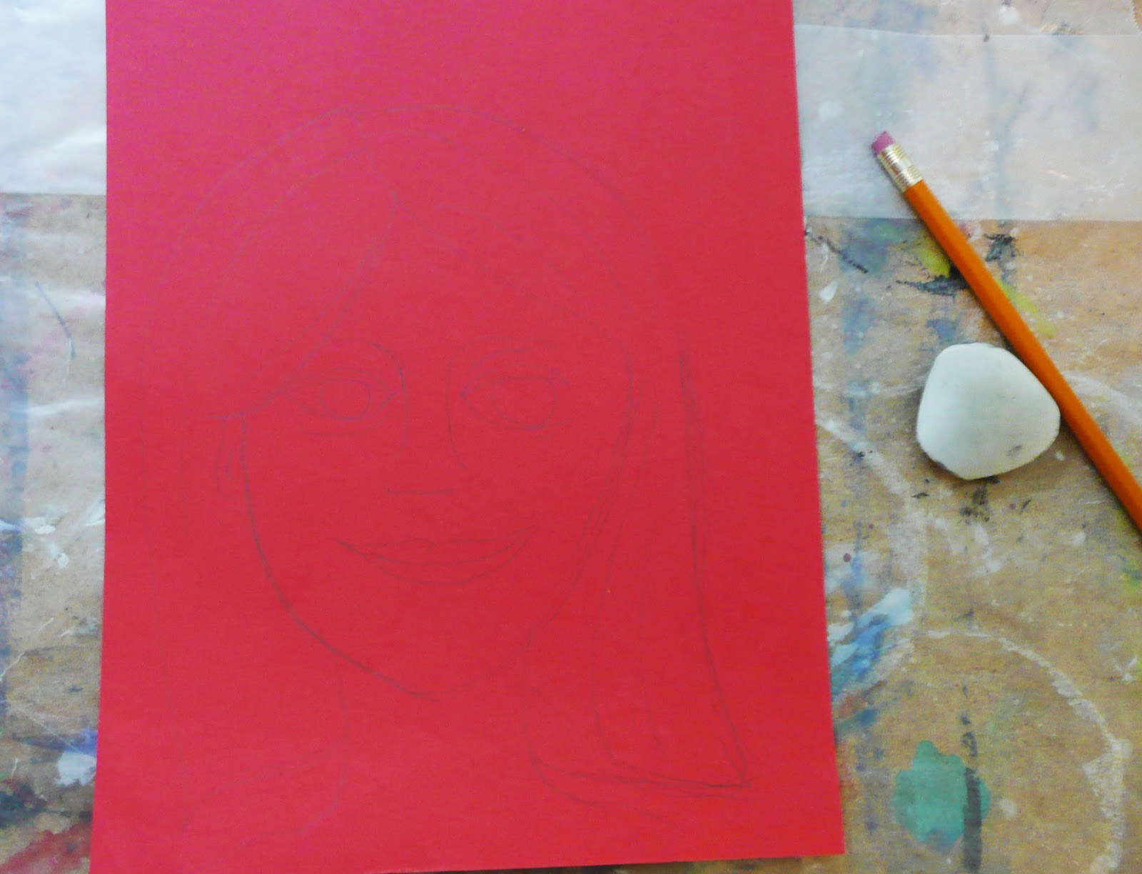 Using a piece of paper cut slightly smaller than the canvas board sketch out Mom's portrait.