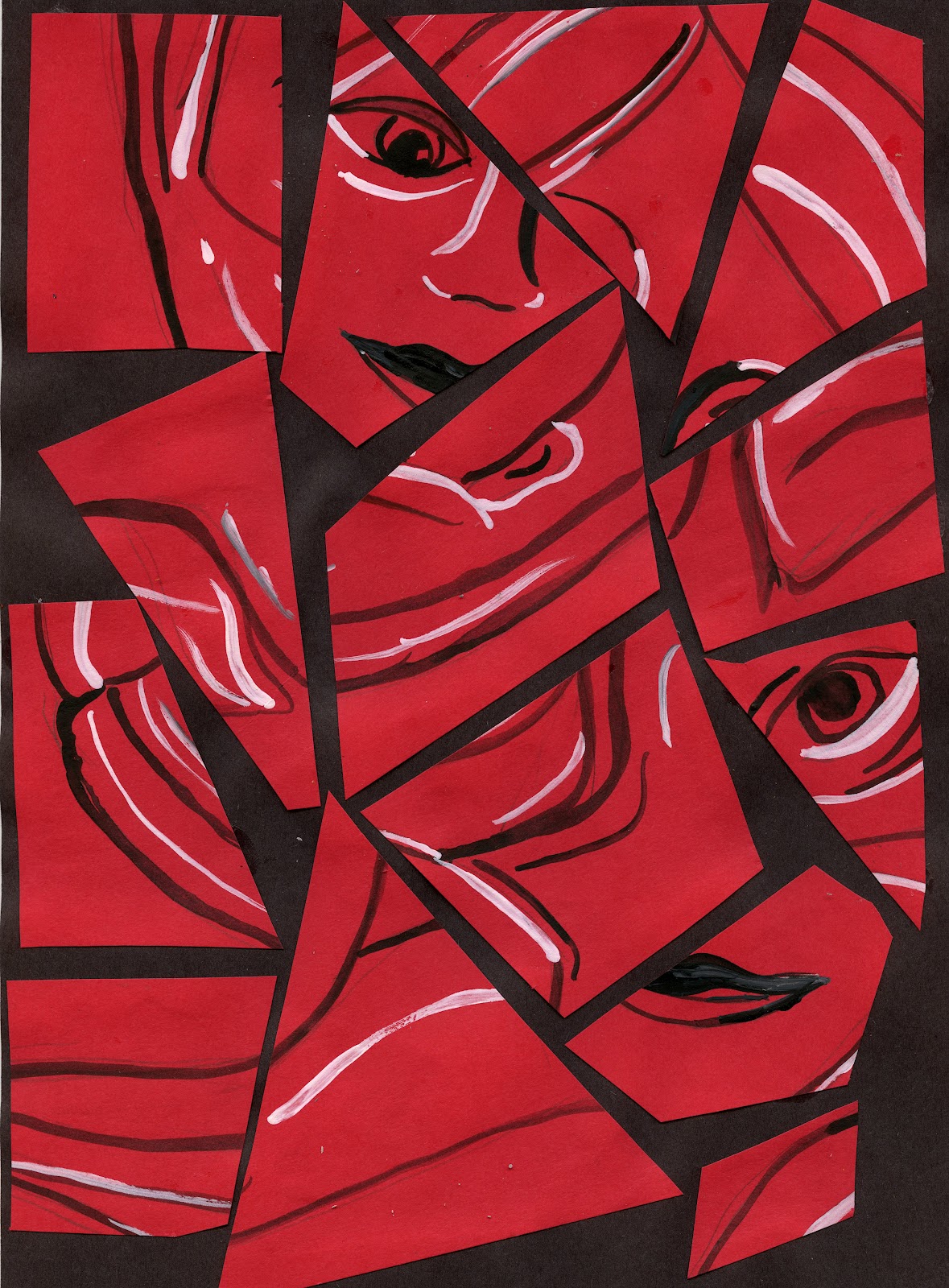 Take your mounting paper,arrange the cut up pieces and then glue into place. Remind the students that this is not a puzzle, the pieces should be out of synch.