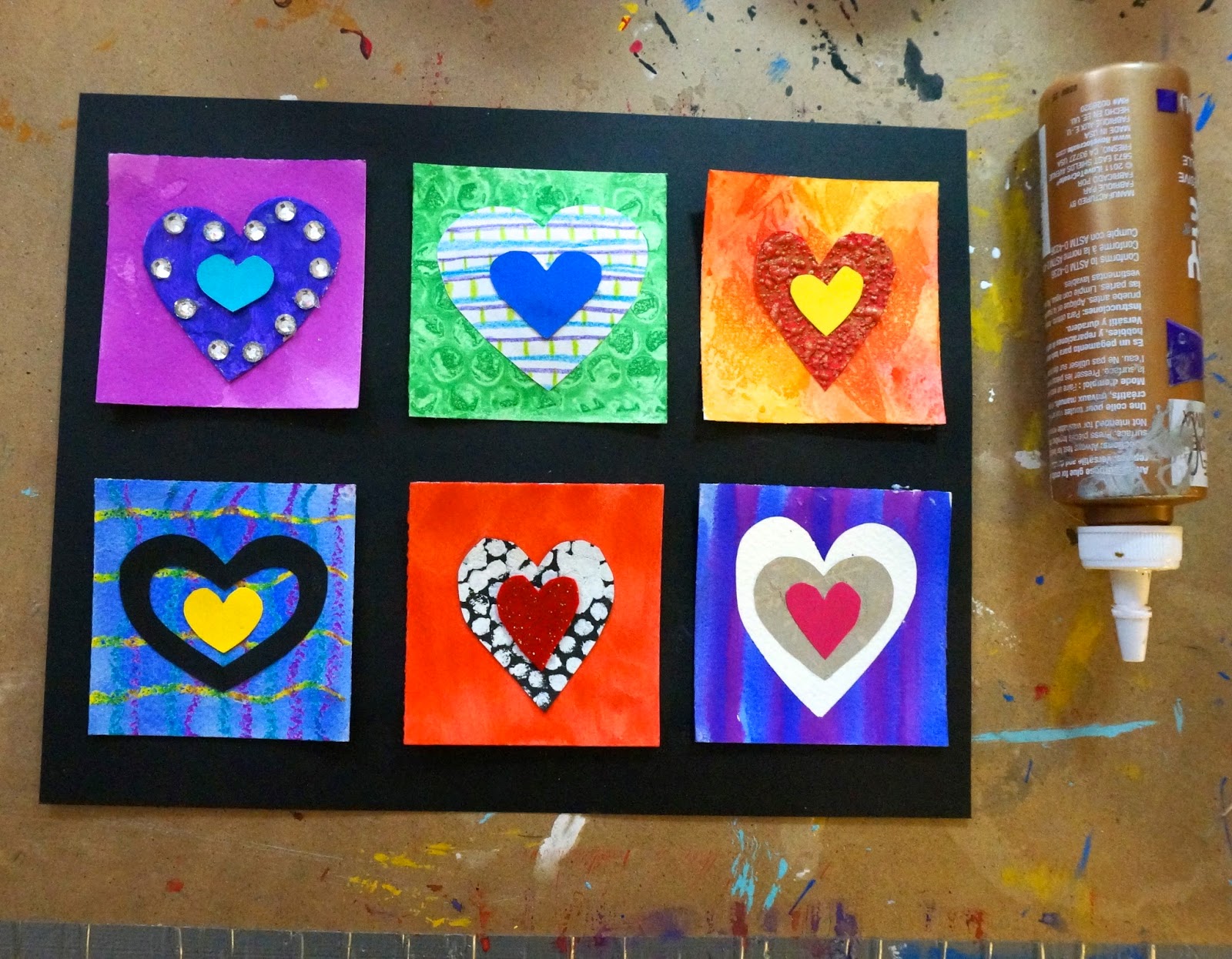 I have been doing Valentine inchies , (post 2) with Grade 2 for a few years now but this year I paired it with a lesson on warm/cool colours. I love teaching inchies as I can show kids lots of techniques in one project.