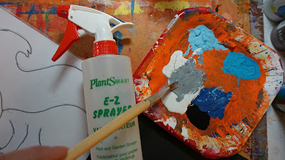 We are going to paint on the wax paper and then transfer this to the construction paper. It helps to work in a small section at a time and it also helps to have your paint a bit watery. I use a spray bottle to add a bit of water to my paint.