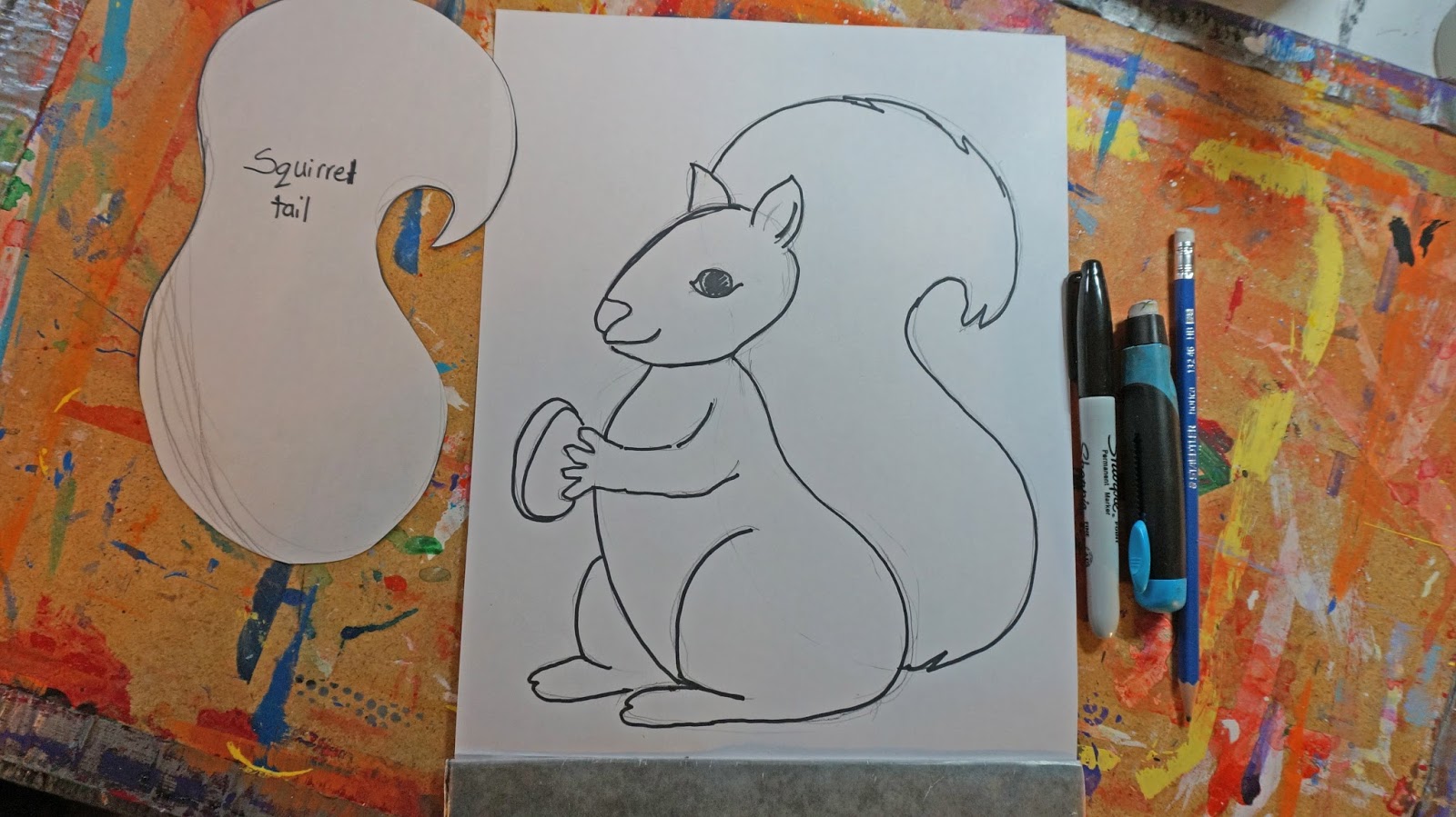 Make your squirrel drawing. I find it helpful to provide younger kids with a tail shape to base their drawing off of.