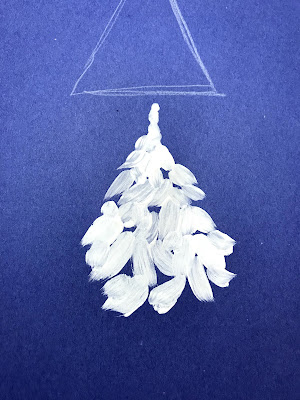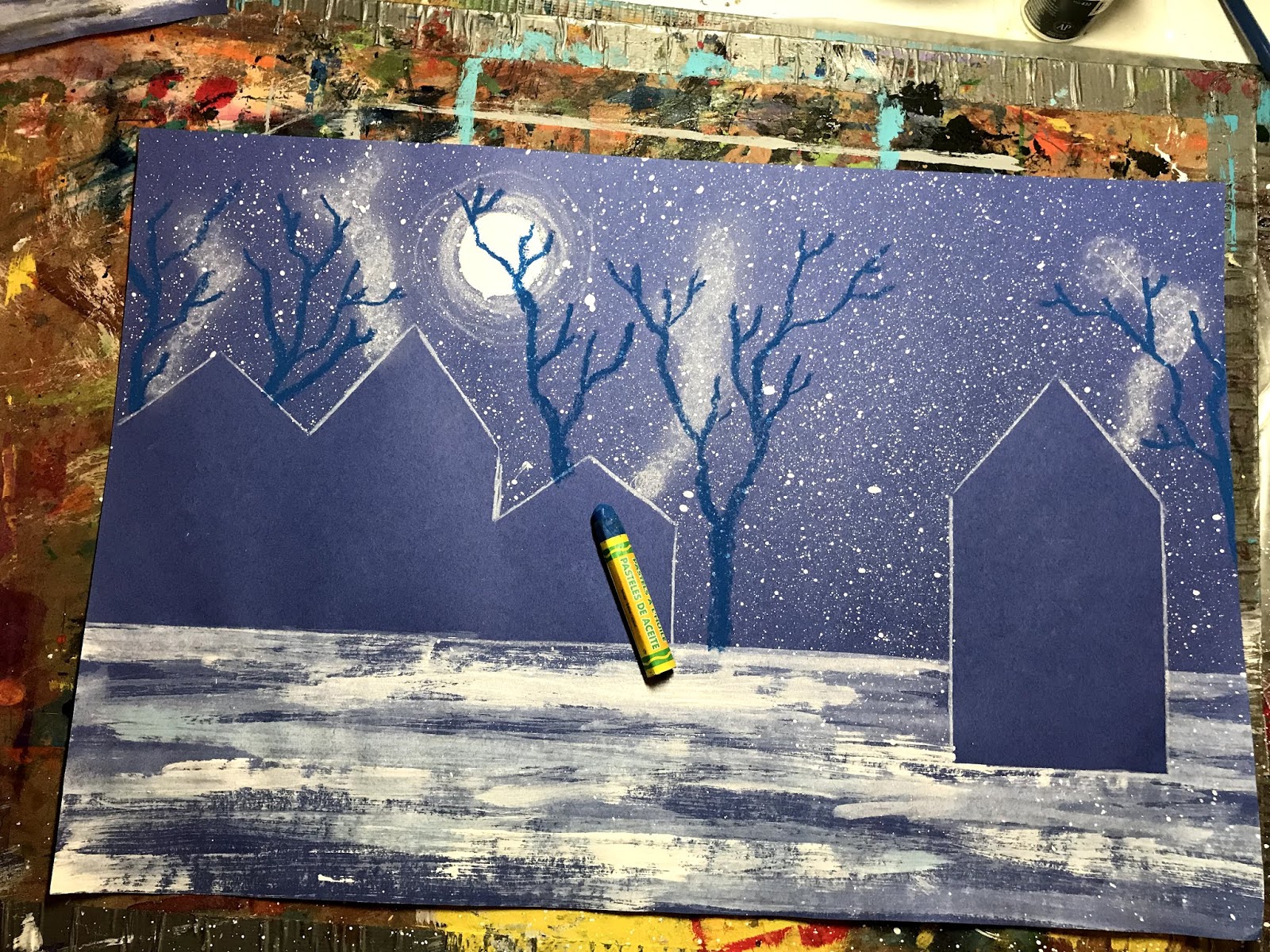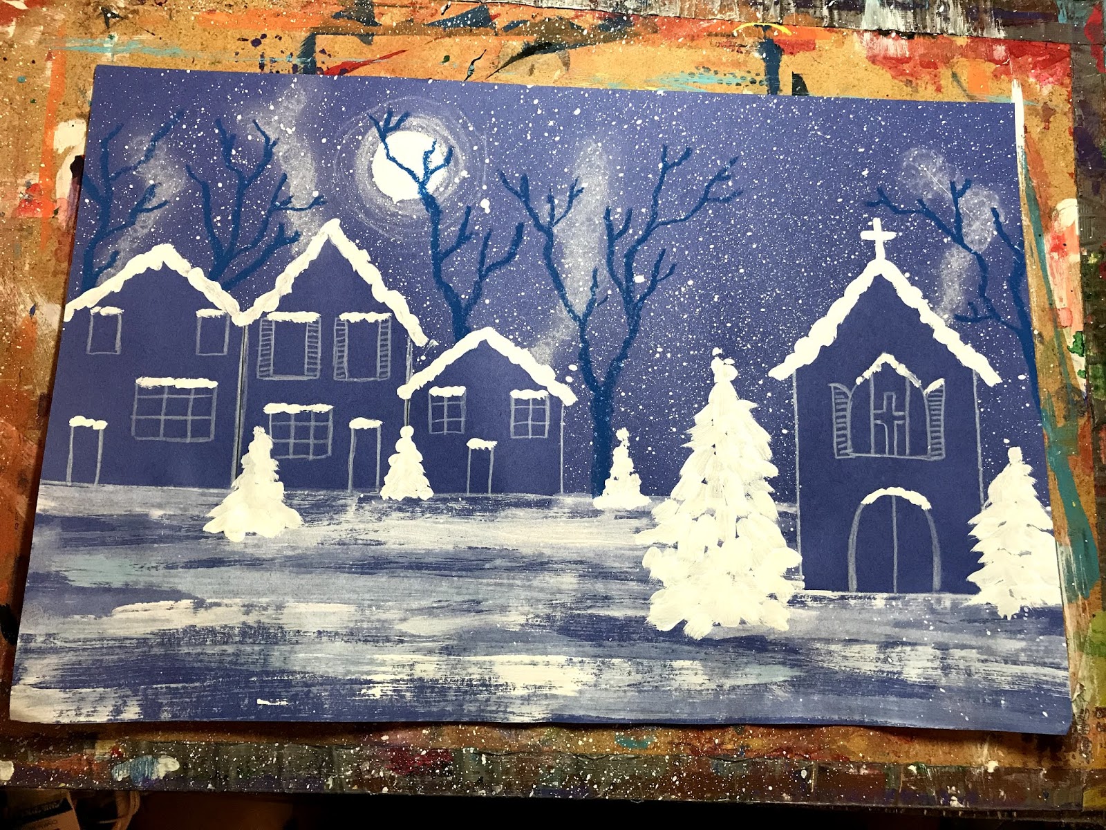So I found a picture on Pinterest of kids painting these snowy village paintings but no directions so I broke it down for you. Many thanks to the original art teacher for such a great idea :)
